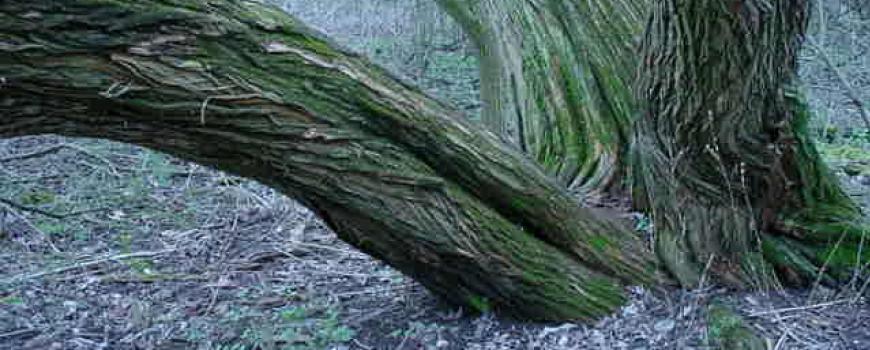 Take a close look at the bark and roots of the tree. The grayish-green papery growths on its bark are lichens. A lichen is actually two species – a fungus which provides nutrients and an algae which transforms energy from the sun into food via photosynthesis. They are some of the heartiest photosynthetic organisms, growing very slowly but surviving harsh conditions. They can grow on soil and even on rock. In northern areas reindeer moss, which isn’t a moss at all but a lichen, provide are an important food source for caribou.